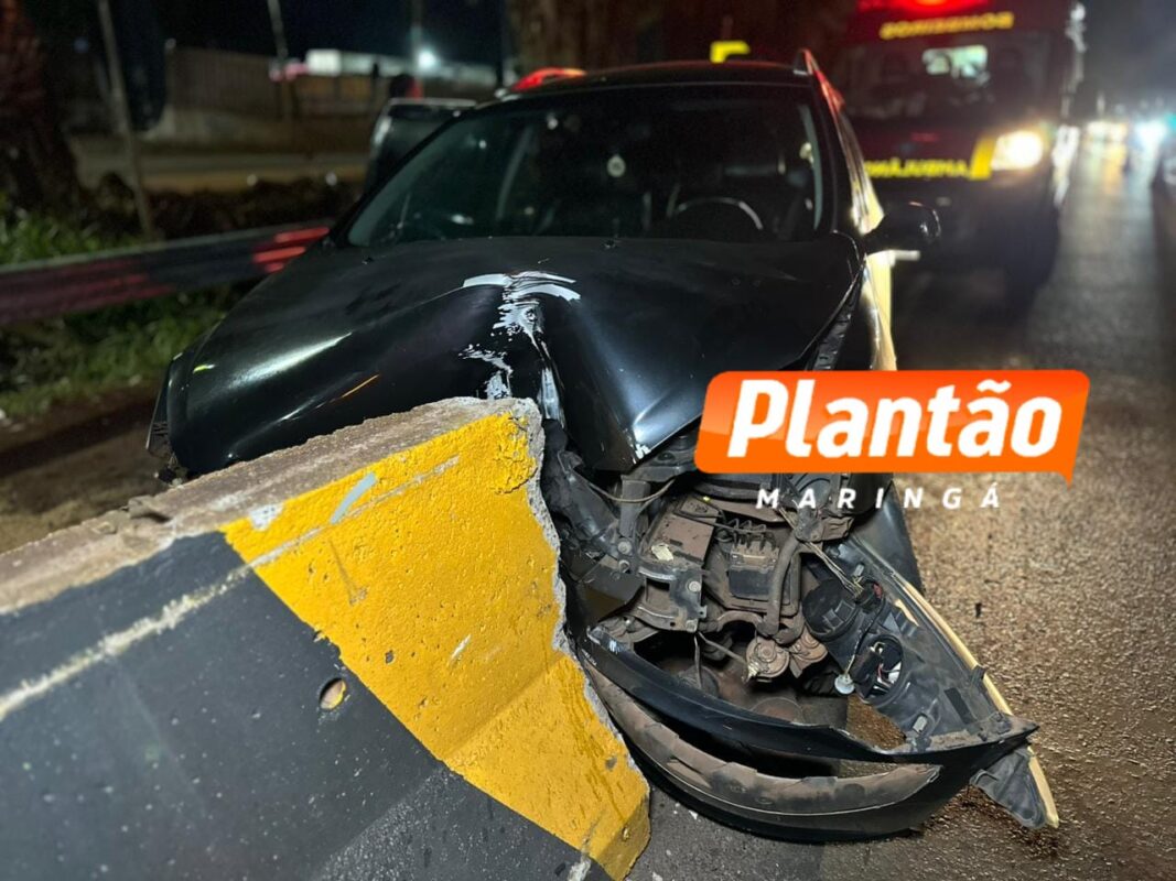 O condutor de um automóvel Peugeot perdeu o controle da direção e colidiu violentamente contra a mureta de proteção da obra do viaduto na Avenida Colombo (BR-376), em Sarandi, na noite deste sábado (31).