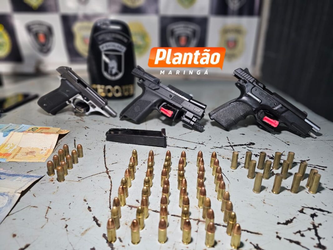 Na noite deste sábado (10), uma equipe do Pelotão de Choque da Polícia Militar apreendeu três pistolas e porções de cocaína durante patrulhamento no bairro Parque Itaipu, em Maringá.