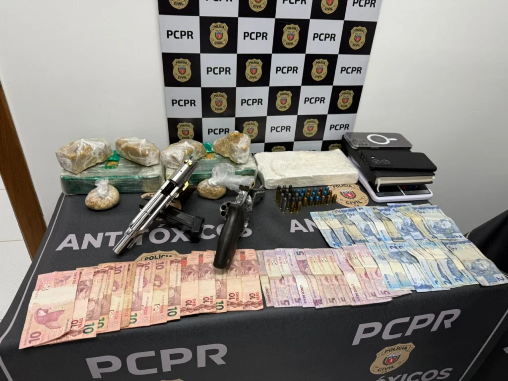 Durante as buscas, os policiais apreenderam cerca de 1 quilo de cocaína e aproximadamente 3 quilos de crack, além de um revólver calibre .38 e uma pistola calibre .380. Também foram recolhidas balanças de precisão, aparelhos celulares e uma agenda com anotações que indicam a movimentação do tráfico de drogas. O homem foi preso em flagrante e encaminhado à delegacia, onde permanece à disposição da Justiça.