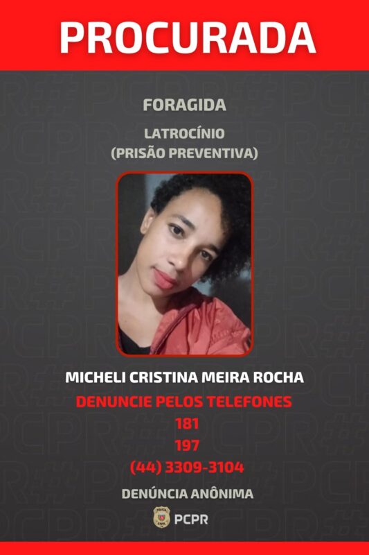 Denúncias – A PCPR pede o apoio da população com informações que possam ajudar na localização da foragida. As denúncias podem ser feitas de forma anônima pelos telefones 197 (PCPR), 181 (Disque-Denúncia) ou diretamente com a equipe de investigação pelo número (44) 3309-3104.