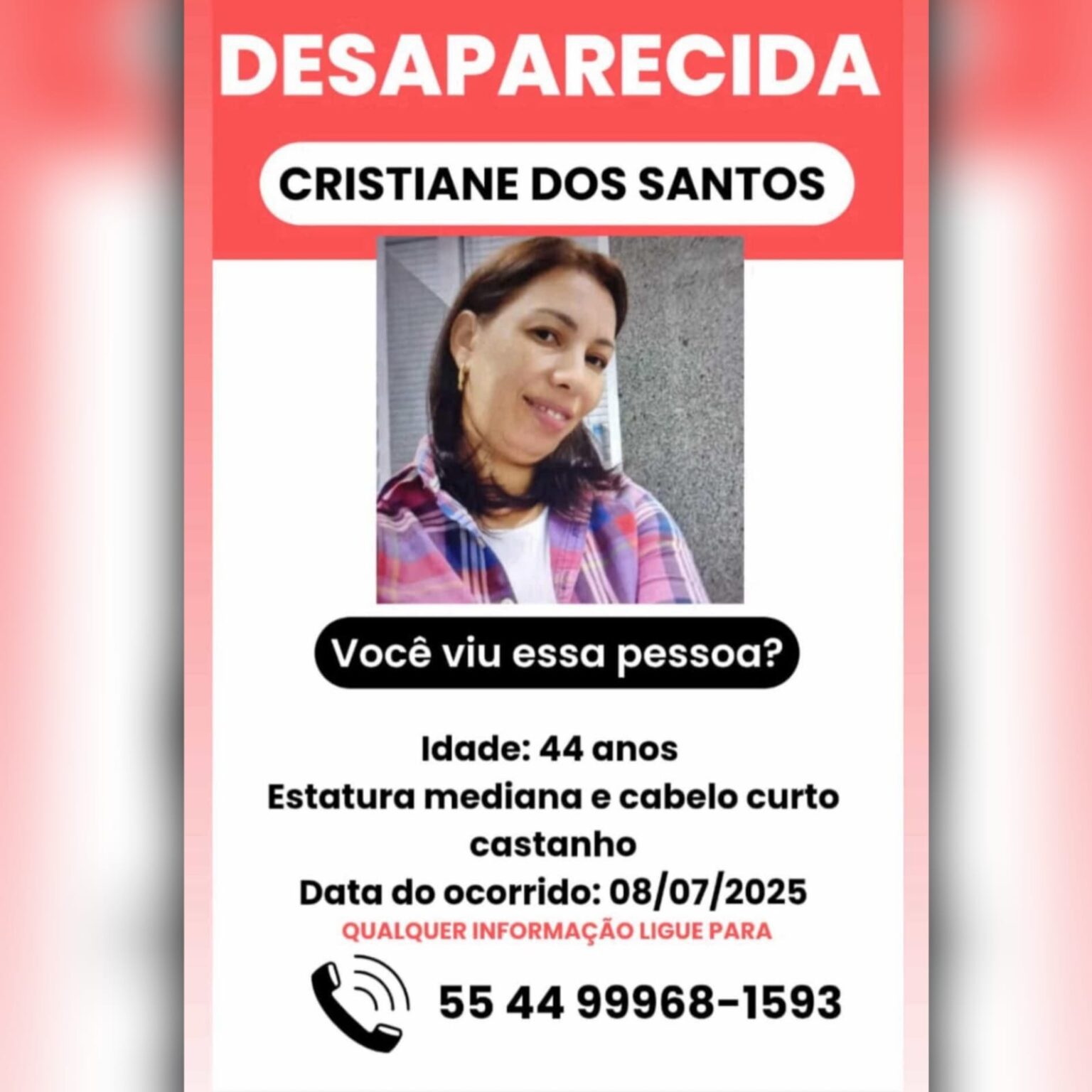 A mãe de Cristiane, Luzia Lucimere Farias, fez um apelo emocionado. Ela contou que a falta de informações sobre o paradeiro da filha tem afetado sua saúde. “Eu tenho uma dor tão grande que esses dias fui parar no hospital com início de infarto. Peço para quem viu minha filha ligar para o 190 e não passar informações falsas”, desabafou.
