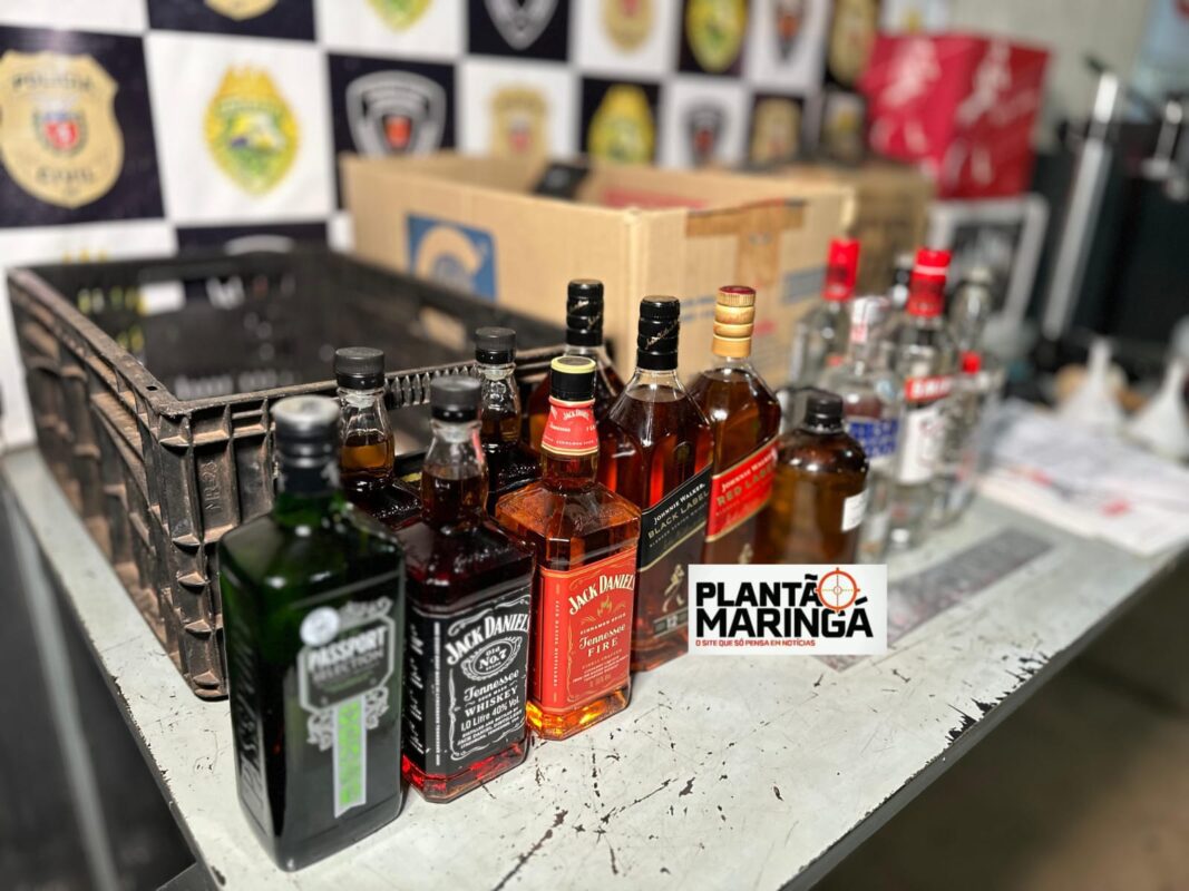 A Polícia Militar (PM) desmantelou uma fábrica clandestina de bebidas alcoólicas na noite desta sexta-feira (13) em Maringá. O estabelecimento, localizado na Rua Pioneiro Dionísio Volpi Frediani, no bairro Jardim Novo Oasis, estava falsificando marcas de whisky e vodka. O responsável pela operação foi preso, e várias bebidas adulteradas foram apreendidas.