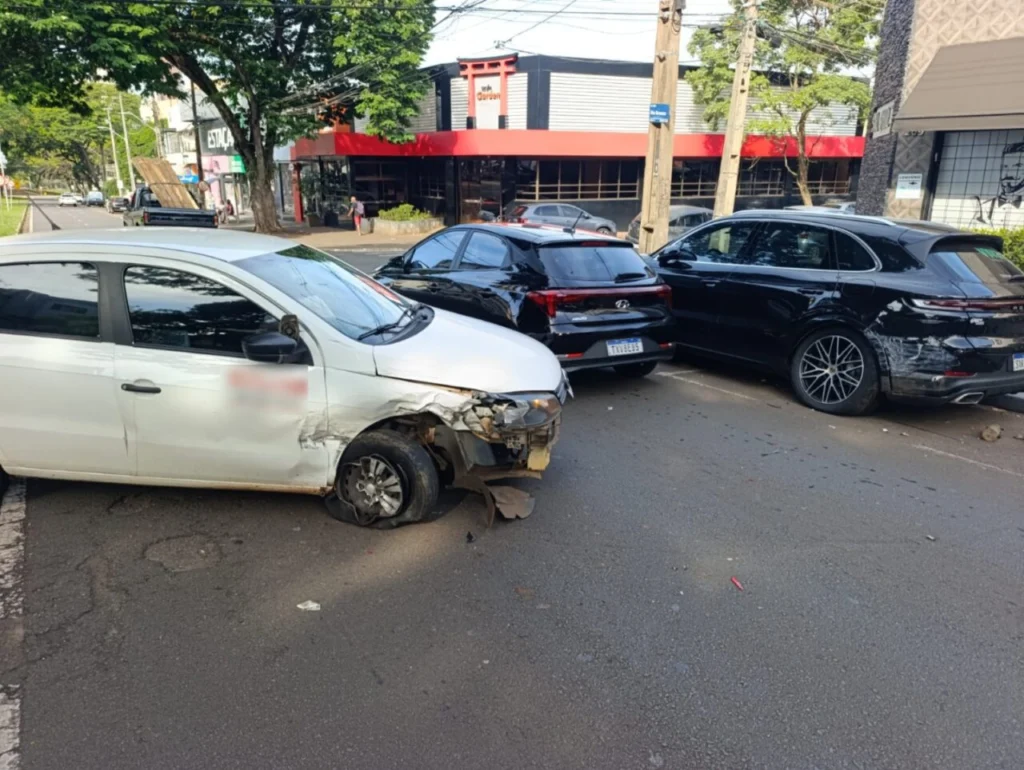 Um acidente envolvendo três veículos foi registrado na tarde desta segunda-feira, 20, na Avenida Rio Branco, na Zona 5, em Maringá. De acordo com informações apuradas pela reportagem, o condutor de um dos veículos teria passado mal enquanto dirigia, o que provocou a sequência de colisões.