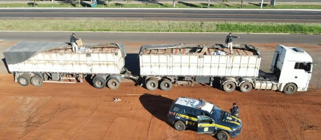 Uma carreta bitrem de nove eixos foi flagrada transportando 600 mil maços de cigarros do Paraguai. O flagrante foi nesta quinta-feira, 15, na BR-163 em Terra Roxa. Policiais rodoviários federais abordaram a carreta e questionaram o motorista sobre a carga. Ele disse que transportava milho, mas ficou nervoso quando os policiais pediram que retirasse a lona da carroceria para uma vistoria.