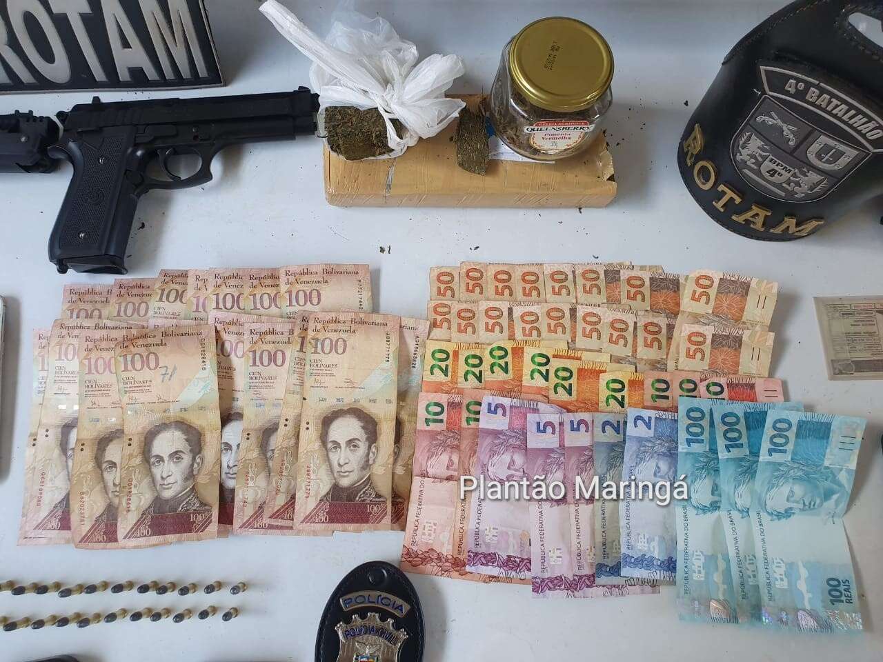 Uma ação conjunta da Polícia Militar – ROTAM (04°BPM) e Civil da cidade de Terra Rica, resultou na prisão de 04 indivíduos, além da apreensão de dois simulacros (armas de brinquedo), munições de calibre 22, dinheiro (real e bolívar – moeda venezuelana), maconha, um veículo furtado, dezenas de objetos de procedência duvidosa e dois pássaros que foram confirmados que são produtos de furto. A operação policial ocorreu em bairros da zona sul de Maringá. A ação das forças de segurança, aconteceu em decorrência do cumprimento de um mandado de busca e apreensão, expedido pelo poder judiciário da cidade de Terra Rica.