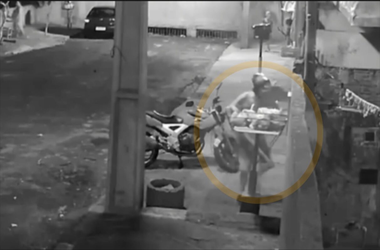 De acordo com as imagens, o suspeito chega em frente à residência da namorada em uma motocicleta. Em seguida, ele desce do veículo armado com um machado e passa a golpear o muro do imóvel.