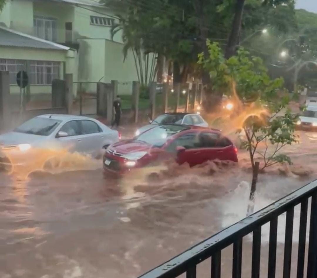 Chuva forte quase arrasta uma moto e um carro em cruzamento da Avenida Guaiapó, em Maringá
