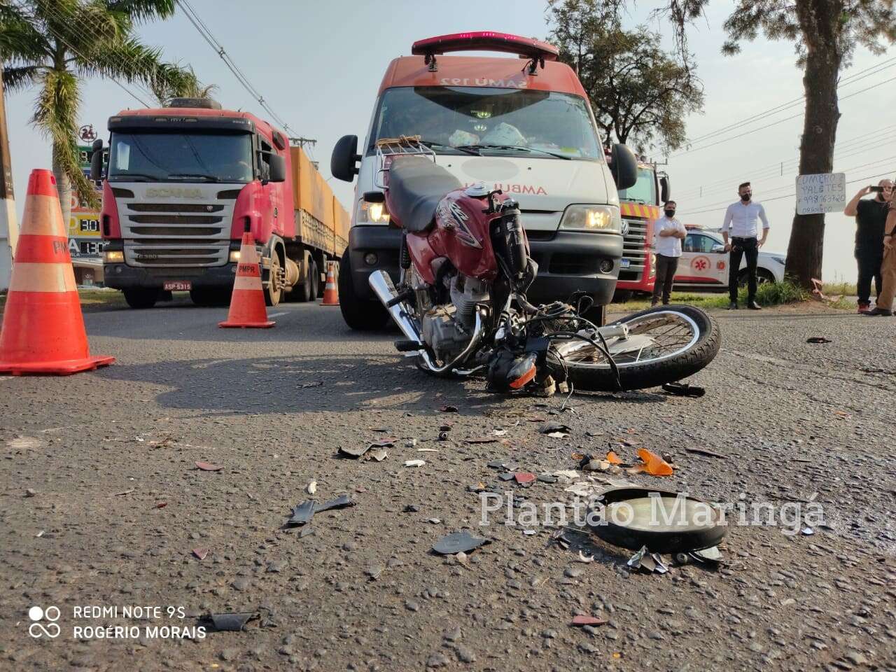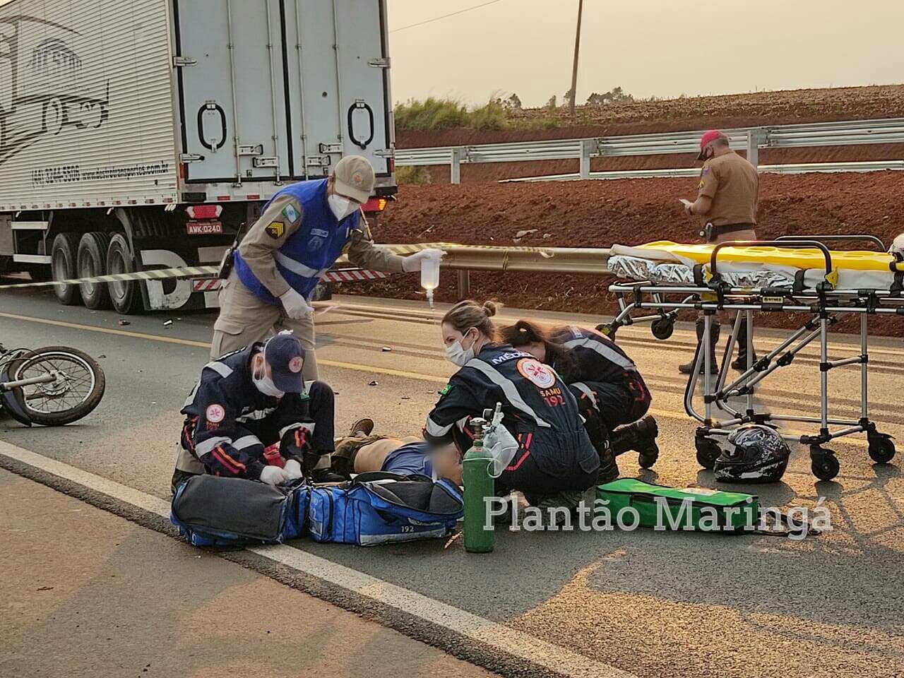 Motociclista é socorrido em estado grave após colisão com carreta em Maringá