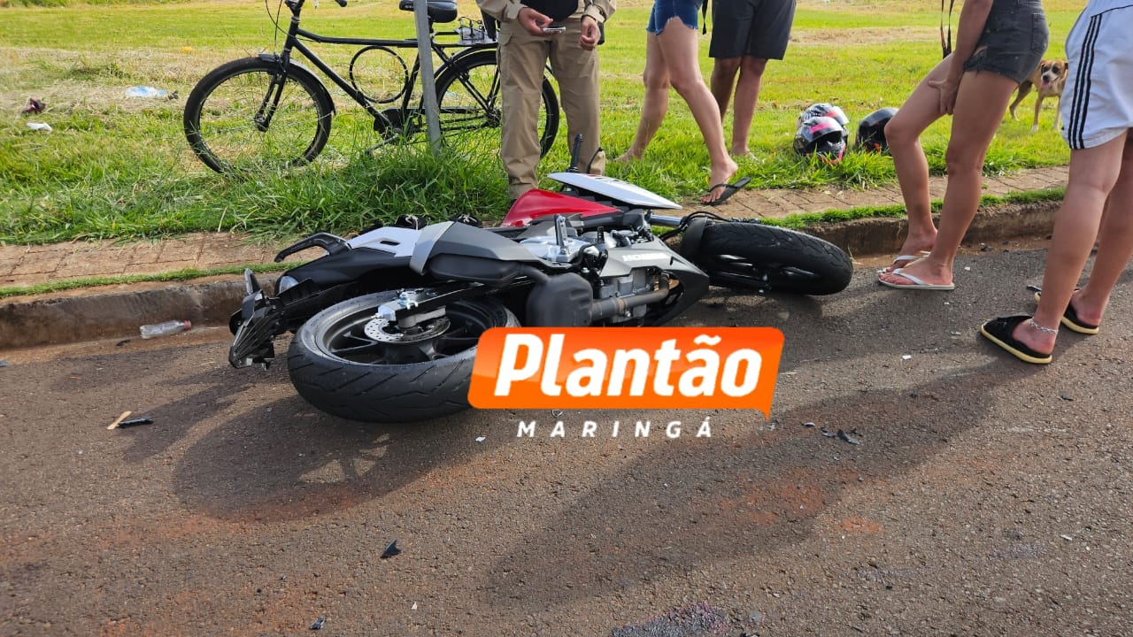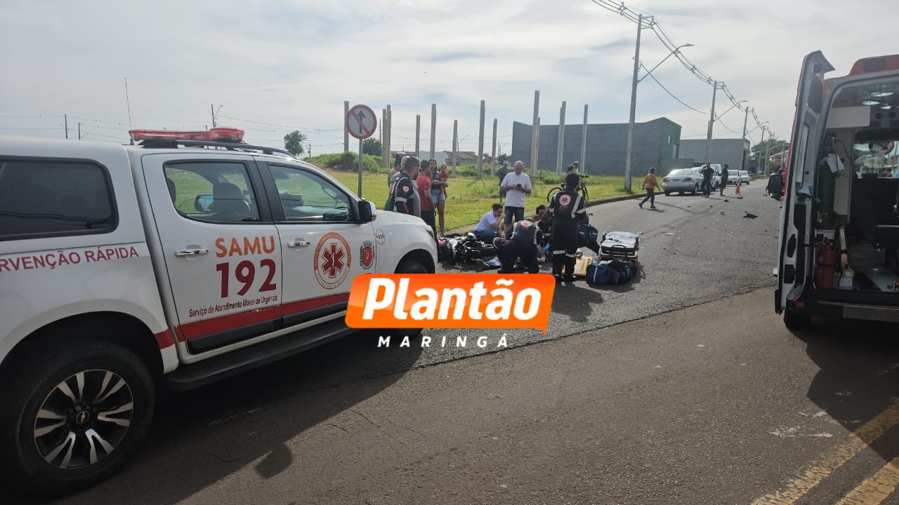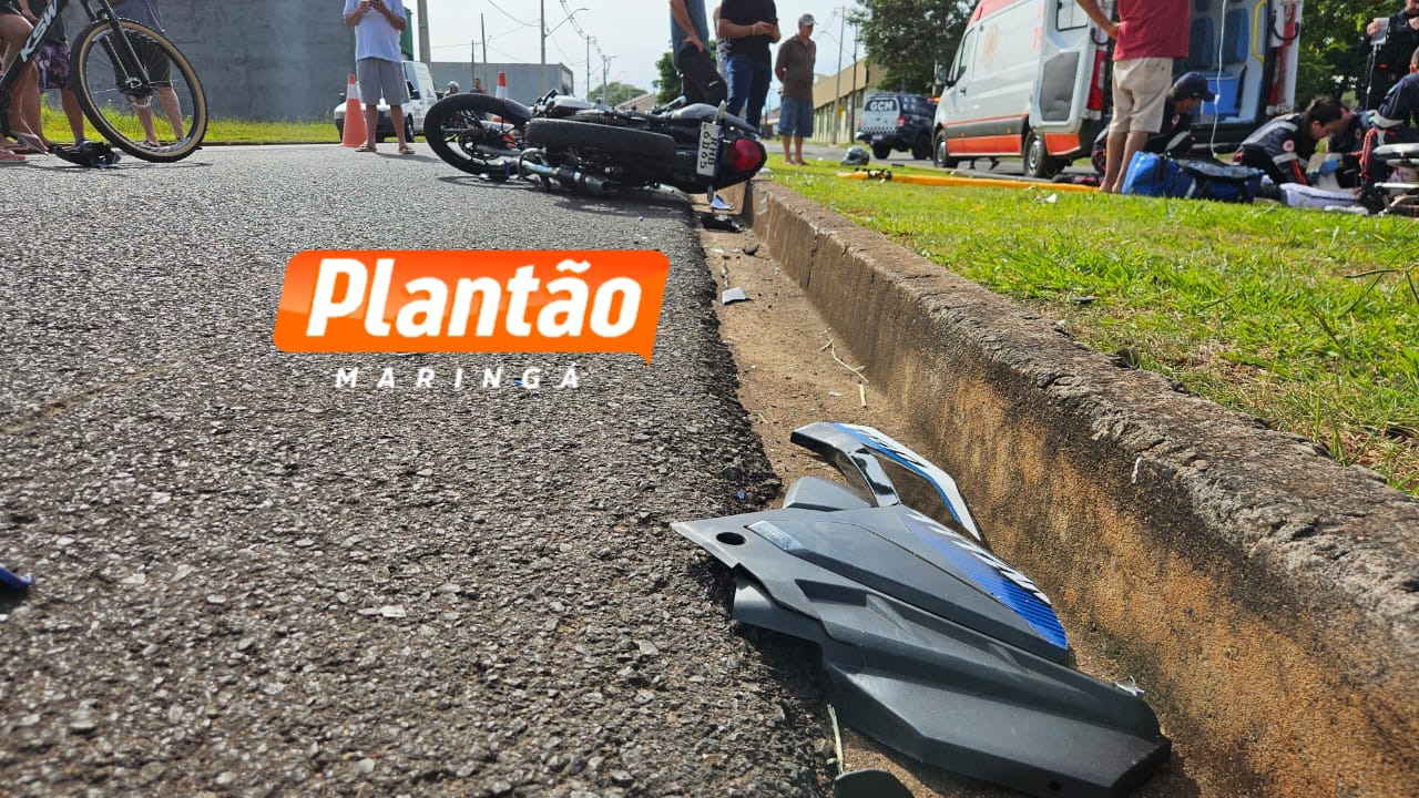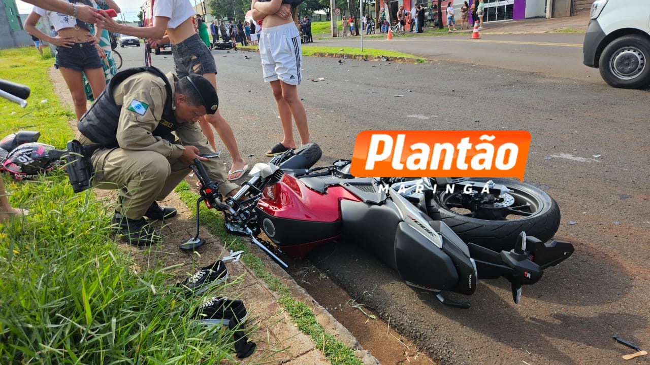 Um grave acidente envolvendo duas motocicletas deixou três pessoas feridas na manhã deste sábado (29). A colisão ocorreu na Avenida Vereador Antônio Bortolotto, no distrito de Iguatemi, em Maringá.