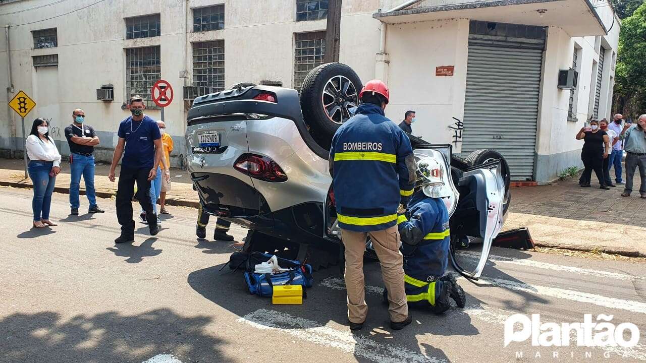 Com o impacto, o veículo capotou. A vítima sofreu lesões leves.