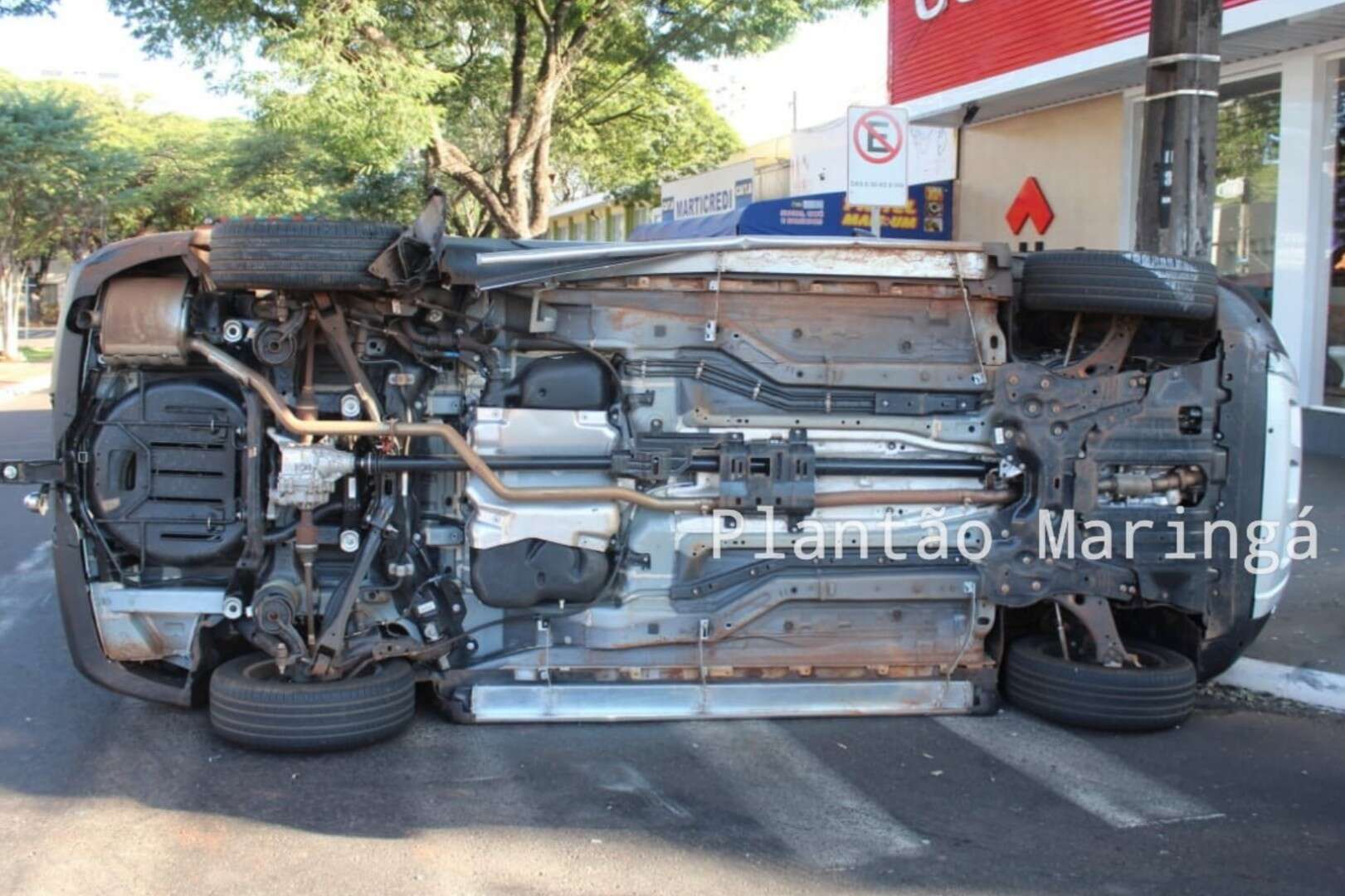 Um carro tombou após colidir com outro veículo na Avenida Colombo, no bairro Zona 7, na tarde desta quinta-feira (20), em Maringá.
