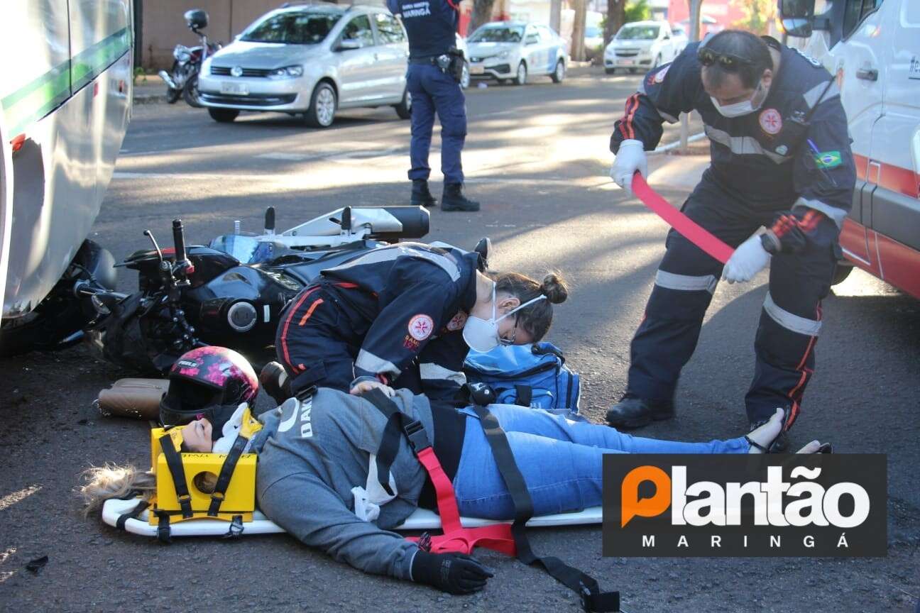Uma câmera de segurança flagrou o acidente entre uma moto e um ônibus que deixou uma moça ferida na manhã desta sexta-feira (07), em Maringá. A batida ocorreu no cruzamento entre a Avenida Laguna e Avenida Riachuelo, na Vila Operária. Veja o vídeo aqui