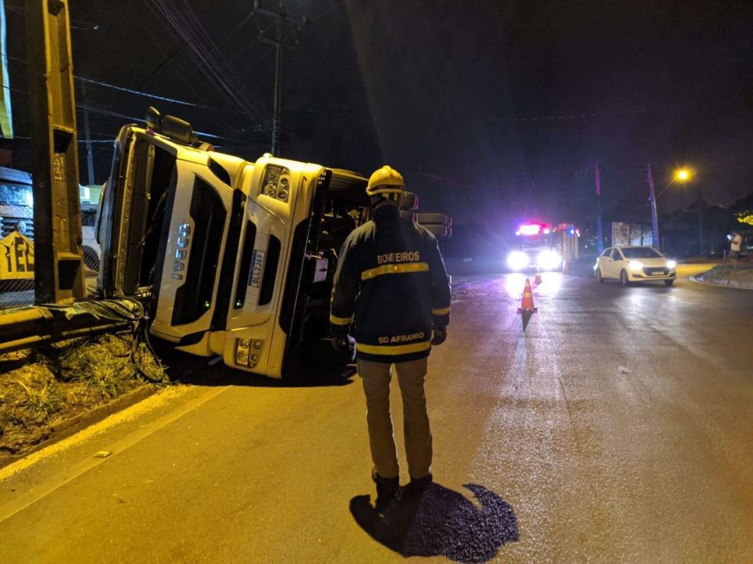 Na imagem é possível ver o momento em que a carreta entra na rotatória e acaba tombando. Vários outros tombamentos ocorreram, nesta rotatória. de acordo com, os socorristas não houve vitimas.