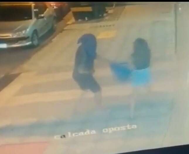 O ladrão, que está encapuzado, desembarca de um veículo de cor prata e surpreende a vítima enquanto ela caminhava na calçada do outro lado da rua. As imagens mostram que ela chega a reagir no momento em que ele pega a bolsa.
