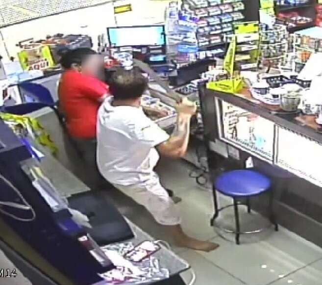 Uma câmera de segurança flagrou o momento em que uma mulher é ameaçada por um homem armado com um facão durante um assalto a um posto de combustível em Maringá. (Veja vídeo aqui).