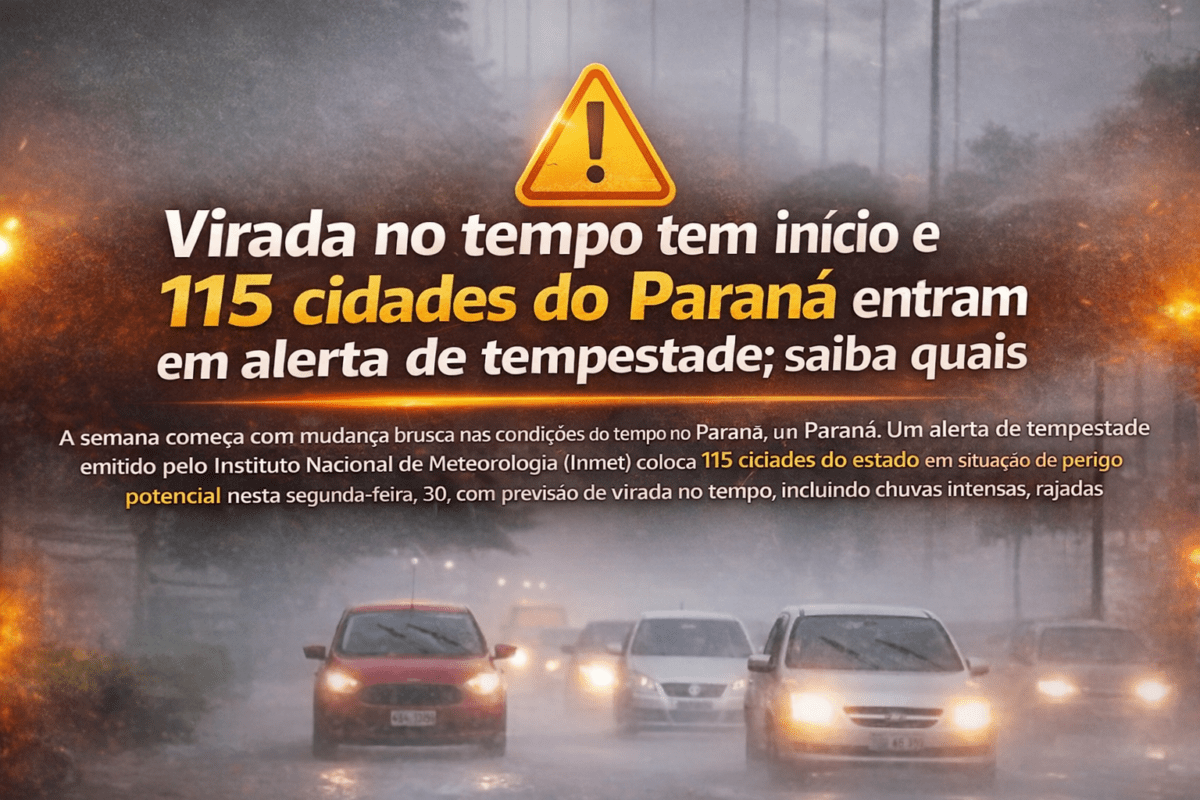 A semana começa com mudança brusca nas condições do tempo no Paraná. Um alerta de tempestade emitido pelo Instituto Nacional de Meteorologia (Inmet) coloca 115 cidades do estado em situação de perigo potencial nesta segunda-feira, 30, com previsão de virada no tempo, incluindo chuvas intensas, rajadas de vento e possibilidade de granizo.